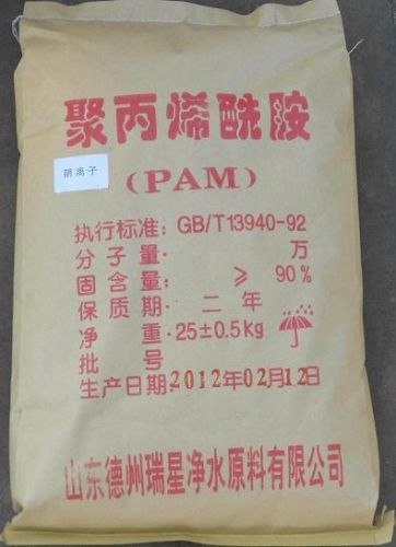 饮用水处理: 一般选用高分子量为宜. 我国很多水厂的水源来自江河, 泥沙及矿物质含量高, 比较浑浊, 虽经过沉淀过滤, 仍不能达到要求, 需要投加絮凝剂. 过去水厂多采用无机絮凝剂, 但投加量大, 易造成二次污泥增加. 现采用阴离子聚丙烯酰胺作絮凝剂, 投加量是无机絮凝剂的1/50, 但效果是无机絮凝剂的几倍. 对于有机物污染严重的江河水可采用我公司生产的无机絮凝剂和阳离子聚丙烯酰胺配合使用效果更好.