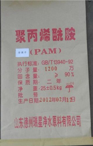 污水处理剂 : 当悬浮性污水显酸性时, 采用非离子聚丙烯酰胺作絮凝剂较为合适. 这时PAM起吸附架桥作用, 使悬浮的粒子产生絮凝沉淀, 达到净化污水的目的. 也可用于自来水的净化, 尤其是和无机絮凝剂配合使用, 在水处理中效果最佳.