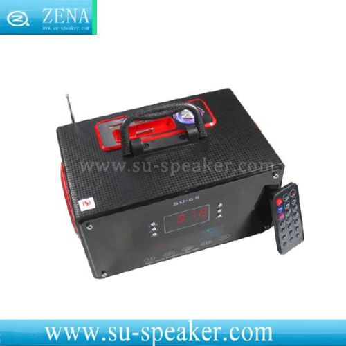Flash Light SD Card Slot Alarm Clock USB Speaker for iPhone SU-68 Feature 1. LED Screen; 2. Wooden Box; 3. Remote Control; 4. FM Radio; 5. Alarm Clock; 6. Support U-Disk, SD Card Slot, iPhone Slot, 3.5mm LINE-IN to play; 7. DC-5V USB charging; 8. Buttons for play/ pause, volume and play order. Parameter 1. Output: RMS 6W (3W+3W) THD=10%; 2. Frequency Response: 150-18000Hz; 3. SNR: ≥80dB; 4. Loud Speaker: 3 inch * 2, magnetic resistant 40hms. Accessories Standar 3.5mm audio plug USB supply power cable Remote control Package 1. Product Size: 23.0*15.3*11.6 cm; 2. Color Box Size: 26.4*18.9*14.9cm; 3. Weight: 1.340kg. |