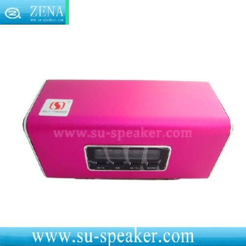 Mini Portable Promotional Item Speaker SU-102 Feature 1. LCD Screen; 2. FM Radio; 3. Support U-Disk, TF Card, 3.5mm LINE-IN to play; 4. DC-5V USB charging; 5. Aluminium alloy shell; 6. Buttons for MENU, play/ pause, volume and play order. Paremeter 1. Output: RMS 5W (2.5W+2.5W) THD=10%; 2. Frequency Response: 150-18000Hz; 3. SNR: ≥80dB; 4. Loud Speaker: 1.5inch (extermal diameter 50mm) , magnetic resistant 4 ohms. Accessories Standar 3.5mm audio plug USB supply power cable Package 1. Product Size: 11.1*5.4*5.3 cm; 2. Color Box Size: 11.3*7.3*5.6 cm; 3. Weight: 0.310kg. |
