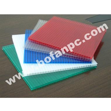 | Products Name: Hollow Products Detail: Twin-wall polycarbonate sheet 1) Thickness: 4mm, 4.5mm, 5mm, 6mm, 8mm, 10mm, 12mm, Standard width and length: 2100 x 6000mm 2) Light weight 3) High impact strength 4) Fire retardancy 5) Good Light transmission 6) With UV protection and thermal insulation 7) Excellent physical, mechanical, and electrical properties 8) Inhibits condensation 9) Customized dimensions, thickness and colors available upon request http: //www.bofanpanel.com/ |