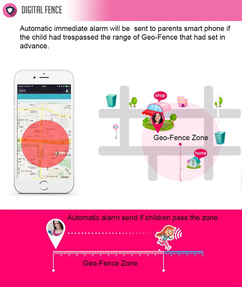 Pre-set Geo-fence area, parents will be given notice if your child is going out/ in of the alarm area.