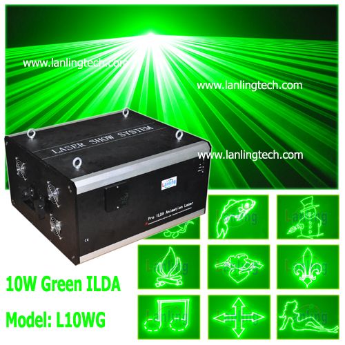 10W Green ILDA Laser light (L10WG) Description: 10000mW Green Animation laser Light Feature: Animation Green laser with high-speed optical scanner to create animated graphics, 256 beam show and graphics show patterns, and with the function of unique blanking, frequently flashing, rotating, movement, billowing, zoom (+/-), drawing and speed etc. Scanner 40kpss High-speed optical scanner, big angle scanning (0 to 30° )eg; )eg; ) Optional 50K Laser Green: 10000mW 532nm, TE-cooled Play Mode: Sound Active, AUTO-Beam, AUTO-Animation, DMX, Master/ Slave, PC Control DMX channel: 12 PC Control: Compatible ILDA laser show software with ILDA interface. Use electronic switches to conversion full ILDA signal Safety Capacity: Design according to security and good performance, safer to human and environment. Master/Slave mode, DMX512 mode and PC Control mode, will shut off laser automatically without trigger signal Power Supply: Bi-Voltage 110V to 220V-250V, 50/60Hz, 50W Net Weight 38Kg Accessories Included: User's Manual Power Supply: Cable (UK, USA, EURO, AUS, BRZ, etc). Excluded: DMX cable dB25 ILDA/PC Cable Laser software, such as Quickshow, LD2000, iShow, Mamba Black, Phoenix, or others. Applicable Place: Logo, company advertising, superstar fashion show, DJs, Bands, Bars, Pubs, Clubs, Roller skating rinks, KTV, Family party, etc. Customized OEM, ODM