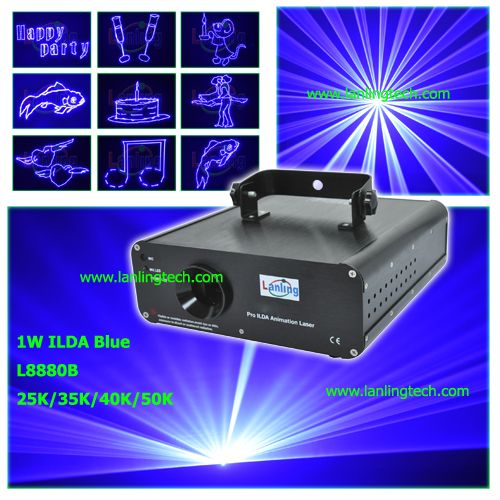 1000mw blue Animation Laser Light (L8880B) Description 1000mW Blue Animation ILDA laser Light/Blue cartoon laser/blue logo laser Feature: Animation Blue laser with high-speed optical scanner to create animated graphics, 256 beam show and graphics show patterns, and with the function of unique blanking, frequently flashing, rotating, movement, billowing, zoom (+/-), drawing and speed etc. Scanner 10kpss High-speed optical scanner, big angle scanning (0 to 30 degree ) Optional 25K, 30K, 40K, 50K Laser Blue: 1000mW 450nm, TE-cooled Play Mode: Sound Active, AUTO-Beam, AUTO-Animation, DMX, Master/ Slave, PC Control DMX channel: 12 PC Control: Compatible ILDA laser show software with ILDA interface. Use electronic switches to conversion full ILDA signal Safety Capacity Design according to security and good performance, safer to human and environment. Master/Slave mode, DMX512 mode and PC Control mode, will shut off laser automatically without trigger signal Power Supply: Bi-Voltage 110V to 220V-250V, 50/60Hz, 50W Inner Box 478*390*215(0.040CBM ) Outer Box 510*410*460(0.096CBM ) 2PCS/carton Accessories Included: User' s Manual Power Supply Cable (UK, USA, EURO, AUS, BRZ, etc). Excluded: DMX cable dB25 ILDA/PC Cable Laser software, such as Quickshow, LD2000, iShow, Mamba Black, Phoenix, or others. Applicable Place: Logo, company advertising, superstar fashion show, DJs, Bands, Bars, Pubs, Clubs, Roller skating rinks, KTV, Family party, etc. Customized: OEM, ODM