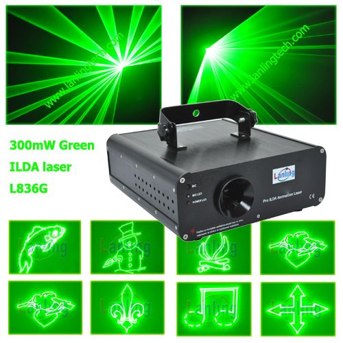 300mW Green Animation Laser Light (L836G) Description 300mW Green Animation laser Light/Green ILDA laser light Feature: Animation laser with high-speed optical scanner to create animated graphics, 256 beam show and graphics show patterns, and with the function of unique blanking, frequently flashing, rotating, movement, billowing, zoom (+/-), drawing and speed etc. Scanner 10kpss High-speed optical scanner, big angle scanning (0 to 30° )eg; )eg; ) Laser Green: 300mW 532nm, Play Mode: Sound Active, AUTO-Beam, AUTO-Animation, DMX, Master/ Slave, PC Control DMX channel: 12 PC Control: Compatible ILDA laser show software with ILDA interface. Use electronic switches to conversion full ILDA signal Safety Capacity Design according to security and good performance, safer to human and environment. Master/Slave mode, DMX512 mode and PC Control mode, will shut off laser automatically without trigger signal Power Supply: Bi-Voltage 110V to 220V-250V, 50/60Hz, 50W Accessories Included: User's Manual Power Supply: Cable (UK, USA, EURO, AUS, BRZ, etc). Excluded: DMX cable dB25 ILDA/PC Cable Laser software, such as Quickshow, LD2000, iShow, Mamba Black, Phoenix, or others. Applicable Place: Logo, company advertising, superstar fashion show, DJs, Bands, Bars, Pubs, Clubs, Roller skating rinks, KTV, Family party, etc. Customized: OEM, ODM