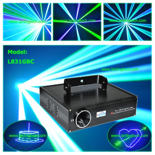 Laser show system GBC cartoon laser light ( L831GBC ) Description 450mW Three Color GBC Animation laser Light Feature: GBC Three color animation laser with high-speed optical scanner to create animated graphics, 128 beam show and graphics show patterns, and with the function of unique blanking, frequently flashing, rotating, movement, billowing, zoom(+/-), drawing, speed and color etc. Scanner: 25kpss High-speed optical scanner, big angle scanning (0 to 30° )deg; )eg; ) Optional: 10K, 30K, 40K, 50K Laser Green: 250mW 532nm, TE-cooled Blue: 500mW 450nm, TE-cooled Mixed cyan: 750mW Play Mode: Sound Active, AUTO-Beam, AUTO-Animation, DMX512 (12 channels), Master/ Slave, PC Control PC Control: Compatible ILDA laser show software with ILDA interface. Use electronic switches to conversion full ILDA signal Safety Capacity: Design according to security and good performance, safer to human and environment. Master/Slave mode, DMX512 mode and PC Control mode, will shut off laser automatically without trigger signal Power Supply: Bi-Voltage 110V to 220V-250V, 50/60Hz, 50W Accessories Included: User's Manual Power Supply: Cable (UK, USA, EURO, AUS, BRZ). Optional: DMX cable dB25 ILDA/PC Cable Flight case Laser software, such as Quickshow, LD2000, iShow, Mamba Black, Phoenix, or others. Applicable Place: Logo, company advertising, superstar fashion show, DJs, Bands, Bars, Pubs, Clubs, Roller skating rinks, KTV, Family party, etc. Customized: OEM, ODM