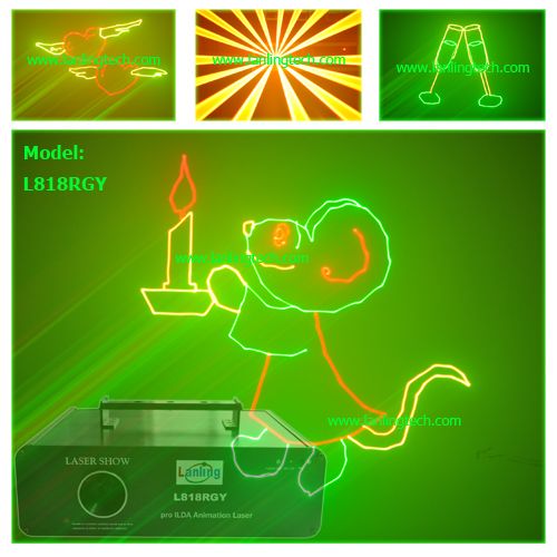 Animation laser 300mw RGY-L818RGY Description 300mW RGY Animation laser Light/ILDA laser/Cartoon laser light/ RGY laser show system Feature: Animation RGY laser with high-speed optical scanner to create animated graphics, 256 beam show and graphics show patterns, and with the function of unique blanking, frequently flashing, rotating, movement, billowing, zoom (+/-), drawing and speed etc. Scanner 10kpss High-speed optical scanner, big angle scanning (0 to 30 degree ) Optional 25K, 30K, 40K, 50K Laser Red: 200mW 650nm, Green: 100mW 532nm, mixed Yellow: 300mW Play Mode: Sound Active, AUTO-Beam, AUTO-Animation, DMX, Master/ Slave, PC Control DMX channel: 12 PC Control: Compatible ILDA laser show software with ILDA interface. Use electronic switches to conversion full ILDA signal Safety Capacity: Design according to security and good performance, safer to human and environment. Master/Slave mode, DMX512 mode and PC Control mode, will shut off laser automatically without trigger signal Power Supply: Bi-Voltage 110V to 220V-250V, 50/60Hz, 50W Accessories Included: User' s Manual Power Supply Cable (UK, USA, EURO, AUS, BRZ, etc). Excluded: DMX cable / dB25 ILDA/PC Cable Laser software, such as Quickshow, LD2000, iShow, Mamba Black, Phoenix, or others. Applicable Place: Logo, company advertising, superstar fashion show, DJs, Bands, Bars, Pubs, Clubs, Roller skating rinks, KTV, Family party, etc. Customized: OEM, ODM