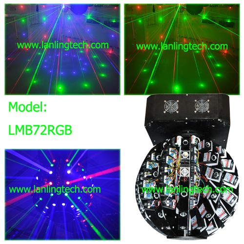 Lanling Stage Moving Head Light RGB Laser Ball lighting- (LMB72RGB) Description 72 Lens 13.2W RGB Beam-Storm Spinning Laser Magic Ball Feature: This is a super bright beam-storm laser ball patented by Lanling. All beams go to every corner with ball angle. This laser ball can move around at 540° With slow or fast speed. It has the functions of spin speed, laser position selection, color, color changing speed, strobe, blackout, flowing, etc. On the easy-to-use LCD indicator, this light can be set to the stay-still mode or moving mode. mode.mode. Ball Spin angle: 540 degree; Vertual Operating platform: LCD1602 indicator and 4-in-1 key control, easy to use Laser Fat-Beam Green: 24PCS 50mW 532nm Fat-Beam Red: 24PCS 200mW 650nm Fat-Beam Blue: 24PCS 300mW 450nm Total power: 13.2W Play Mode Sound Active, AUTO-Beam, DMX, Master/ Slave DMX channel: 6 Power Supply Bi-Voltage 110V to 220V-250V, 50/60Hz, 50W Net Weight 34Kg Gross Weight 55Kg (in Flight case) Volume Weight 48Kg (/5000) or 40Kg(/6000), with flightcase Item Size 350x350x550mm Inner Box 520*520*800(0.22m³ )up3; )up3; ) Outer Box 520*520*800(0.22m³ )1PCS/flightcasehtcasehtcase Accessories Included: User' s Manual Power Supply Cable (UK, USA, EURO, AUS, BRZ). Flight case Excluded: DMX cable Applicable Place company advertising, superstar fashion show, DJs, Bands, Bars, Pubs, Clubs, Roller skating rinks, KTV, Family party, etc. Customized OEM, ODM