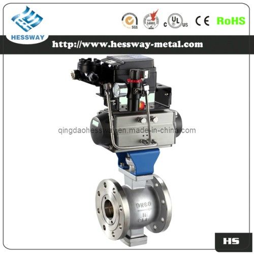 Pneumatic V-type ball valve, ball core is V-shape, can realize the linear adjustment, widely adjustable range, when the valve closed, between the V-type gap and the seat produced wedge shear function, and has not only self clean function, but also prevent the ball core jammed, especially suitable for pipeline scaling and frozen occasion. It is suitable for control pulp,sewage,contain fiber and solid particle suspended medium and powder granular media.