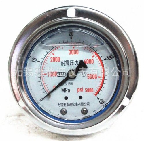 轴向带边耐震压力表是在普通压力表的基础上, 表壳为全密闭型结构, 内部填充阻尼液(一般为甘油或者硅油)并加装缓冲机构, 减轻环境剧烈振动及介质脉冲对仪表示值的影响, 轴向带边耐震压力表利用自带的圆形或者方型安装盘固定在设备面板上, 便于操作工人随时观察压力变化. 耐震型压力表指示稳定清晰. 广泛应用于液压机械, 石油, 化工, 冶金, 矿山机械, 电力设备等部门, 测量对铜和铜合金无腐蚀性介质的压力.