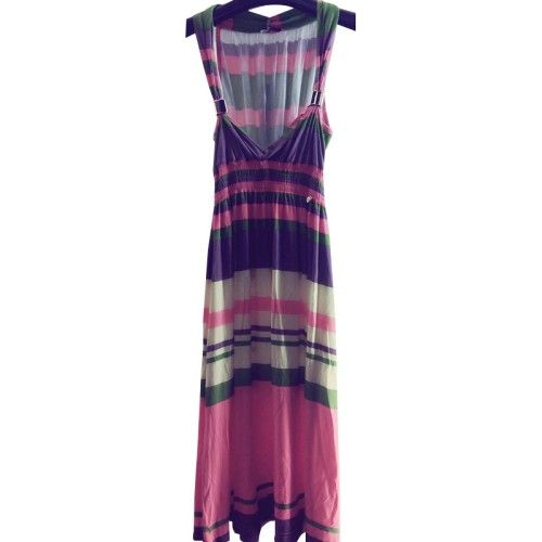 Ladies leisure printed stripe beach dress made by cotton jersey,back neck line with soft gathered,waist with five thin elastic sewn,straped with two metal pipe to adjust neck depth,soft handfeelVery comfortable wearing and very casual styling.