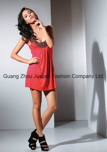 Production Description Fashion Sexy Knit Rayon Beaded Necklance Tops 1.Model No.: 2012QD004 2.MOQ: 300 PCS 3.Fabric: Knit 95% Rayon + 5% Spandex 4.Color: as for the client's requirement 5. Quality: High Quality 6.Packaging: 1 PC/Polybag with hang tag or In accordance with clients request 7.Sample Lead Time: 5-7 days via DHL, TNT, FedEx, and And UPS 5-10 days via EMS 8.Delivery Time: 30 days after the PP sample confirmed Sample rule All of samples can be made as for your requirement 1) Samples are free when ordering in bulk 2) Sample base on customer's requirement will be charged. Sample cost is 3 times of FOB quotation. The sample cost will return after order confirmed. Transportation BY SEA, BY AIR or BY EXPRESS Payment terms Payment: T/T. 30% deposit in advance, 70% balance will be paid before delivery. FAQ 1. Do I need to come to your factory to order? Welcome to visit our office and factory! But if this is out of your budget, do not worry; we can do everything through email, phone and post. 2. Which textiles/fabrics can you work with? We're good at making knitted clothes, woven clothes is also OK for us. It's your choice and we could advice you if you wish for. We're able to work with most kinds of materials. 3. What kind of techniques are you good at? Beading, embroidery, printing, garment dyed, etc. 4. Can I order samples first and then place the bulk order? Yes, we understand that customers want samples firstly, and then need a sales period to collect orders from their customers. This is not a problem; however, we will ask the customer for a small deposit of the bulk order. This deposit will be reimbursed when placing the bulk order. 5. Can I put my own label and logo on the clothes? Yes, and you have two options: 1) Sending your label design to us and we make them for you, but you will need to meet our MOQ 2) Sending your finished labels to us and we put them on the clothes (free of charge), but you will need to meet our MOQ 6. Can you do the design for us? Yes, your own designs/sketches/pictures are welcomed. OEM & ODM are both welcome.come.come. Company Profile Guangzhou Juepell Fashion Company Ltd, which is located in Guangzhou, was founded in year 2000. We have 15 years experience and focus on Woman & man fashion garment, including: Women-Dress, T-shirt, Jacket, Pants, Skirt, etc., etc. etc. We have about 100 workers, covering 3100 square meters. Our production capacity is 30,000 units per month. Offering high quality products with competitive price and good service bring us stable buyers from Germany, USA, Brazil, Australia, etc. We believe our garment experience and responsibility can be your strong back up in China, and hope we can establish friendly business relationship with each other in the future. Welcome you to inquiry about our products, and don't hesitate to contact me, it would be glad if you could visit our company. Thank you. JOY Tel: 0086-13640694432 Fax: 0086-20-66601822