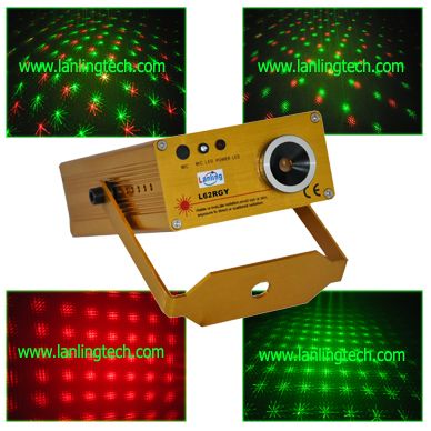 Mini twinkle laser light (L62RGY) Description 100mW RGY Mini Fireworks Twinkling Laser Feature: Auto and Sound active, more than 500 beams shooting out, case color available: Black, blue, golden, green, red and silver. Patterns are same as L629RGY. Packed in gift box Scanning: Micro-step motor scanning at big angle Laser Green: 20mW 532nm Red: 80mW 650nm Mixed yellow: 100mW Play: Mode Sound Active, AUTO Packing: In gift box Power Supply Input: 110V to 220V-250V, 50/60Hz, 10W Output: DC 12V Net Weight: 0.9Kg Accessories Included: User' s Manual, Power adaptor Applicable Place: DJs, Bands, Bars, Pubs, Clubs, KTV, Family party, etc. Customized' OEM, ODMEM, ODM