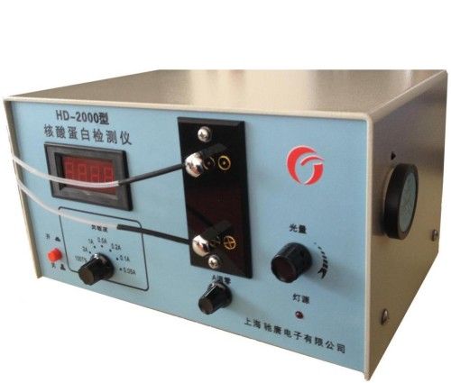 Nucleic acid protein detection instrument (purple outside detection instrument) is liquid phase color spectrum in the of a purple outside detection device, instrument distribution upper analysis column, constant flow pump, part collection device,, that composition a full of liquid phase color spectrum separation analysis device, is engaged in biology research, drug determination, agricultural research, chemical, food and the medical units on has purple outside absorption of samples for quantitative analysis of instrument. HD-9705 nucleic acid-protein detection device imported components, photoelectric tube IP28-increased, stable performance, high sensitivity, easy to use, HD-9704 type monomer model; LED digital display; Second, the main technical data (1) the test wavelength 220 NM, 254nm, 280nm, 340 NM (2) measuring range: 0-100% t, 0-2A, 0-1A, 0-0.5A, 0-0.2A, 0-0.1A, 0-0.05A. (3) color filter: by 254nm, 280nm composed of interference filters. (4) streaming sample pool: volume 100ul, optical path 3mm. Trace sample pool: volume 30ul, optical path 10MM. (5) the range in the 0.05A file: noise ≤ 0.00025Au. (6) the working environment temperature: 0 ℃-35 ℃. (7) the instrument continuously time ≥ 1 month of work. (8) the instrument does not allow any vibrations or magnetic field interference. (9) power supply: 220VAC ±, 50HZ. (10) unit dimensions: 258x133x150 (mm), (11) host: 4kg
