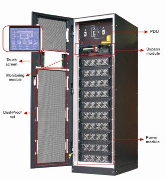 Three phase high frequency Large Power modular UPS System characteristics 1. Modular design, hot swappable. 2. Strong load adaptability for linear and nonlinear load. 3. Intelligent module and system protection design. 4. Incredible low noise system design. 5. Double DSP controller for individual power module. 6. Digital control for the whole parts including rectifier, inverter, charger and discharger. 7. IGBT modules rather than discrete components are applied in the power module. 8. Inbuilt power distribution for input and output connection. 9. Large touch screen LCD with plenty of information. 10. Independent charger for batteries, intelligent battery management system. 11. Digital paralleling technology, very low circle current between modules. 12. Totally front access, top and bottom cable connection. 13. Each individual module is configured with independent controller, avoid single point failure risk.