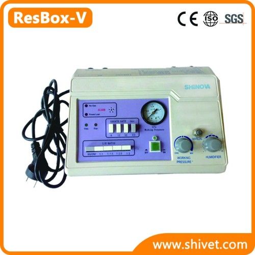 Veterinary Portable Ventilator(ResBox-V) Model: ResBox-V ResBox-V ventilator for beasties that is device according to the principle of open jet ventilator can ventilate with not only high frequency and low volume of humidifying but also regular frequency and great volume. Feature: 1)When the ventilation technique with open high frequency and low humidify volume is adopted, the airway pressure is low with little effect on blood stream returning to its heart and the effect of oxygen compound is good and the oxygen partial pressure can be increased rapidly. While the one with regular frequency and great humidify volume is adopted, CO2 can be ejected easily. 2)Convenient connecting, it can be connected through the nasal and endotracheal tube. 3)The ventilation mode with high frequency and low humidify volume will not easily produce pressure hurt. 4)The effect of oxygen dispersion is so good that the tested beastie can stand for a long time. 5)Adjustable oxygen concentration, the ventilation mode with continuous oxygen stream and good humidifying effect can ensure beastie to respire independently. 6)Be fit for manual ventilation test for monkey, rabbit, dog etc. 7)Configured with multiform ventilation con-duit for beasties or connected with gas source in addition. Specifications: 1)Working voltage: A/C 220V(180-240V available), 50Hz 2)Input power: 18VA 3)Frequency: 8~150 breaths/min, 4)I/E ratio: 1: 1~1: 3 and inverse ratio, 5)Driving Pressure: 0~0.16Mpa, 6)Gas source: High-pressure oxygen source or air compressor. The input pressure is not more than 0.16Mpa, 7)High-pressure gas source: 0.16MPa 8)Output Limit of reductor: Not less than 0.16 Mpa 9)Ventilation Mode: HFJV(High Frequency Jet Ventilation), CPAP (Continuous Positive Airway Pressure), Manual Control Mode. 10)Volume: 276*202*90mm Weight: 1.7Kg
