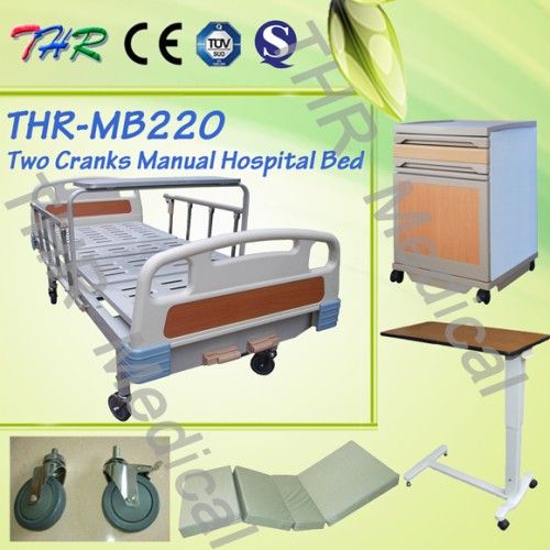 2-function medical manual bed with dining table (THR-MB220) Descriptions: 1. ABS bed head and end board 2. Body of the bed is steel with spray plastic 3. Over bed table 4. Braking castors 5. Aluminum alloy protective rails 6. There are anti-bump cushion devices on the corner of the bed frame for protaction against to wall or ect. Function: Back rest lift angle: 75degree Foot rest lift angle: 40 degree Standard accessory: I. V. Drip holes-----------------------------4 PCS Stainless steel I. V. Pole----------------1PC Over bed dining table--------------------1PC Aluminum alloy side rails---------------1pair 4PCS 125mm dia. Castors-------------4PCS Optional Accessory: Bed Mattress with thickness 6cm, 8cm or 10cm