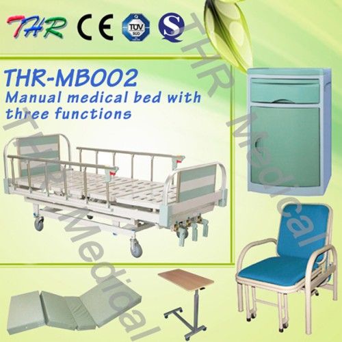 3-Function Manual Hospital Bed(THR-MB002) Dimension: L2140*W970*H400/800mm 1. This 3-crank manual bed is produced with CE quality in sale with very economical Price! ! ! ! 2. The bed surface is made of steel by Powder coated. Punching bed board; 3. The head & foot board are made of Aluminum Material, can be easily assembled and detachable.hable.able. With aluminium alloy guardrail, foldable. 4.3-crank handles control the bed's function, can be hidden into the bed when not use, to prevent any damage. 5. Dia. 125mm casters, two with brake system, silent and Anti Vibrating. 6. With I. V. Pole holes at four position of bed, which can take the transfusion pole into it. 7. There are anti-bump cushion devices on the four corners of the bed frame for protaction against to wall or ect. Function: Height adjustable from 400 to 800mm Back-rest lifting angle is 0-80° (± 5° )plusmn; 5° )g; )plusmn; 5° ) Knee-rest lifting angle is 0-40° (± 5° )plusmn; 5° )g; )plusmn; 5° )
