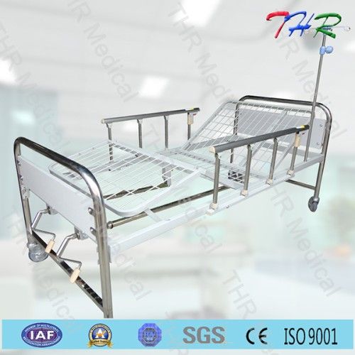 THR-MB242 2-crank Manual Steel Bed 1. Dimension: 2050*900*540mm 2.3-section bed, manually operated, two crank adjustable 3. Steel frame in epoxy finish 4. Epoxy powered coated 5. Divided in sections with 3 different function 6. Two crank adjustable backrest and foot section 7. Stainless steel bed head and bed end board 8. Welded wire mesh mattress platform not the whole metal sheet 9. Four dia. 100mm castors, two with brakes 10. Two retractable side rails made of aluminum alloy material, with IV pole Our advantages: 1. Original Manufacturer, the producing workshop is more than 40000 Square Meters 2. All parts are produced by our factory 3. Strict Material Inspection & Quality Controllingllinglling 4. ISO9001, ISO13485(SGS) Quality Management System 5. More than 10 years experience in producing and engineering 6. CE (SGS) Certificate 7. Products are exported to more than 30 countries