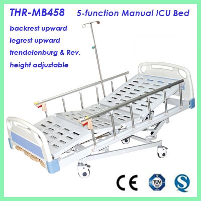 (1)Size: L2100*W970*H500-750mm (2)The ABS head foot board can be easily assembled and dissembled. (3)There are anti-bump cushion devices on the corner of the bed frame for protaction against To wall or ect. (4)Powder coated steel bed frame. (5)Punching bed surface; (6)Sixth-aluminium alloy guardrail, (7)5' castorsastors (8)With I. V. Pole (9)With 4 cranks; Function: (1)Height adjustable 200mm; (2)Back-rest lifting angle is 0-75°°deg;° (3)Knee-rest lifting angle is 0-40°°deg;° (4)Trendelenburg & Rev. Trendelenburg are 12°e 12°deg;e 12° Standard Accessories: (1)1PC bed head board and 1PC bed foot board (2)1pair guardrail (3)4PCS castors; (4)1PC I. V. Pole Our advantages: 1. Original Manufacturer, the producing workshop is more than 40000 Square Meters 2. All parts are produced by our factory 3. Strict Material Inspection & Quality Controllingllinglling 4. ISO9001, ISO13485(SGS) Quality Management System 5. More than 10 years experience in producing and engineering 6. CE (SGS) Certificate 7. Products are exported to more than 30 countries