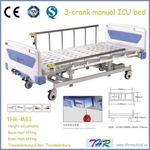 THR-MB3 Hospital Manual ICU Bed 3-crank with 5 functions Available Description: 1) It adopts clutch driving theory which can easily realize the conversion of the five positions. 2) Bed head/foot boards are made of high quality ABS engineering plastic, generous in appearance, freely installed, reliable and easy to clean. 3) Bed frame welded by profile steel are stable and reliable. 4) The surface treated with advanced electrostatic plastic spray is anti-aging and anti-rust. Stainless steel collapsible side rail is easy to use. 5) Aluminum alloy collapsible side rails are easy to operate. 6) 125mm dia. Noiseless individul castors, with brake system. 7) with one functional separation converter to control each function by manual crank respectively.