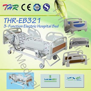 Hotsales THR-EB321 hospital equipment Electric Hospital Bed (THR-EB321) Height adjustable Back rest and leg rest adjustable Trendelenburg CE, ISO certificate Size: 2050*950*510/710mm Function: Angle of back section: 0-75 degree Angle of leg section: 0-40 degree Whole body adjustable height: 200mm(from 500-700mm) Description: 1. Be able to support 250kg 2. Whole piece cold board punch shaped at one time, static powder coating. 3. Bed head and end board use advanced ABS engineering plastic by injection molding 4. There are anti-bump cushion devices on the corner of the bed frame for protaction against to wall or ect. 5. Four PCS ABS engineering plastic by injection molding guardrail 6. Automatic lifting, safe and reliable 7. Four truckles adopt central control system, which is load-endurable, flexible and noiseless 8. Be able to collocate a operate plate for the nurse 9. One set of handset 10. Antistatic, dustproof, mothproof, antisepsis, antirus Standard Accessory: 1 pair detachable ABS head/end bed board 2 pairs foldaway ABS side rails guards 4 PCS 150mm high quality centrol lock castors 4 PCS I. V. Drip holes Optional Accessory: Stainless steel I. V. Pole Overbed table Bedside cabinet 6cm/8cm/10cm bed mattress