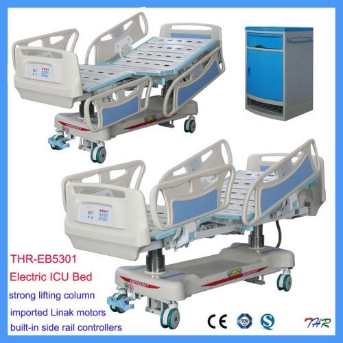 THR-EB5301 Electric Medical Bed -Professioal ICU Use Specificaiton: 1. The bed is made from sturdy metal frame with plastic spraying surface treatment. 3. Height adjustment(520mm-820mm) 4. Angle of backrest's inclination 0 - 75 degree; 5. Angle of legrest's inclination 0 - 45 degree; 6. Trendelenburg/Anti-trendelenburg ± 10 degree; degree; degree; 7. Shankrest board can be adjusted mechanically: 40 degree; 8. Auto contour function: Allows back board and thigh board to adjust simultaneously into a chair position. 9. Removable head and foot board(ABS) 10. ABS Separate side rails 11. Built-in side rail controllers for patient 12. Central control panel(key-press) for caregiver 13. Emergency stop function: The bed can be stopped at all times and positions for one button. 14. Manual CPR set (backrest segment) 15. Rechargeable battery back-up: Up to 72 hours of standby time in normal use and capable of 50 cycles in case of power failure. 16. Four roller bumpers 17. Rise-and-fall guide wheel, Central brake and steering system Our advantages: 1. Original Manufacturer, the producing workshop is more than 40000 Square Meters 2. All parts are produced by our factory 3. Strict Material Inspection & Quality Controllingllinglling 4. ISO9001, ISO13485(SGS) Quality Management System 5. More than 10 years experience in producing and engineering 6. CE (SGS) Certificate 7. Products are exported to more than 30 countries
