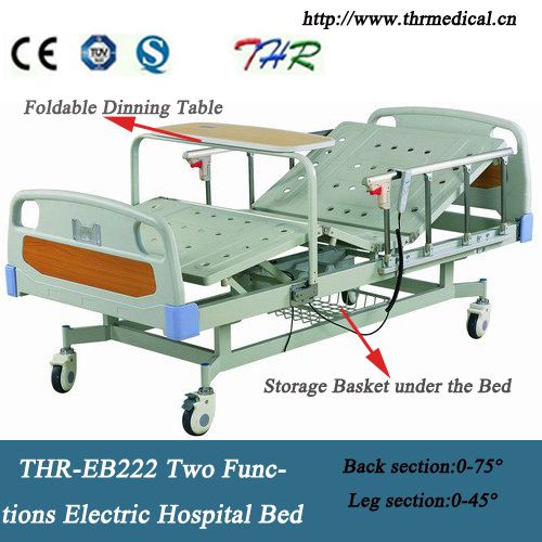 2-Function Electric Hospital Bed (THR-EB222) Size: 2050*930*500 mm Standard Accessories: 1. 1 pair detachable ABS head and end board 2. 1 pair foldaway railing made of aluminum alloy 3. 4 PCS 125 mm high quality castors, two with brakes 4. 4 PCS I. V. Drip holes 5. Overbed dining table 6. Wire meshes basket underbed Function: Back rest lift angle: 75degree Foot rest lift angle: 40 degree Optional accessories: 1. Overbed dining table 2. Bedside cabinet 3. Anti-bedsore air bed mattress 4.6 cm, 8 cm and 10 cm sponge mattress