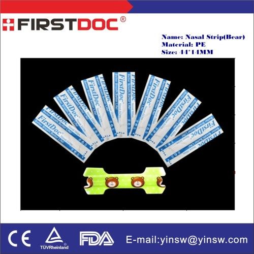 Anti Snoring Nasal Devices/Nasal Strip/Stop Snoring/Breath RightStructure--It's Simple.1) Two flexible 'spring-like' pieces gently lift upwards the congested nasal passages so you can breathe through your nose, close your mouth and stop snoring, allowing you and your partner to get a good night's rest.2) Special adhesive holds the strip comfortably in place.3) Improves airflow by 31%Material: PE, Non-woven cloth and filmCapabilities:1) Peel off intensity ﹥1.0 n / cm2) Air permeation rate ﹥200 g / m 24 h3) Normally no rash or skin irritationFunctions:Expand nasal passages.;Used for relief nasal congestion caused by cold, allergy and rhinitis.Reduce snore and improve breathe for athletes.Indications:Nasal Strips can provide temporary relief from nasal congestion and stuffiness and may also reduce or eliminate snoring.Size is important ---Get the right size for maximum benefitMedium: 55mm x 16mm (fits 75 % of adult noses. )Large: 66mm x 19mm (for an adult with a larger nose)Cautions:1) To get maximum results, please place strip correctly.2) For single use only. Do not use for more than 12 hours.3) Not for children under 5 years old.4) Do not use over sores, sunburned or irritated skin.5) If rash or skin irritation occurs, discontinue use.Expiration: 3 yearsStorage: Store in a cool / dry place.If you have any special requirements, pls email us with your detailed infos such as the size, the material, the color, the imprinting, the packing details and other infos, we will give you the best service at the least time.at the least time.