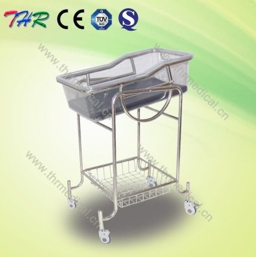 Stainless Steel Reclining Crib Bassinet (THR-RB002) Specification 1. Material: Full Stainless Steel 2. Whole size: 820L× 460W× 750/1000H mm 750/1000H mm 750/1000H mm 3. Cabinet Size: 800L× 460W× 406H mmimes; 406H mmimes; 406H mm Features Description A. Made of high quality 100% stainless steel. B. High grade engineering plastics baby basin is available. C. Stainless steel I. V. Pole, with height adjustable. D. With sundries shelf at the bottom, supplying space for daily use. F. Four castors, two with braking system. G. Reclining design, reverse Trendelenburg 0-10 degree. H. With one key also to keep it on the horizontal position easily.