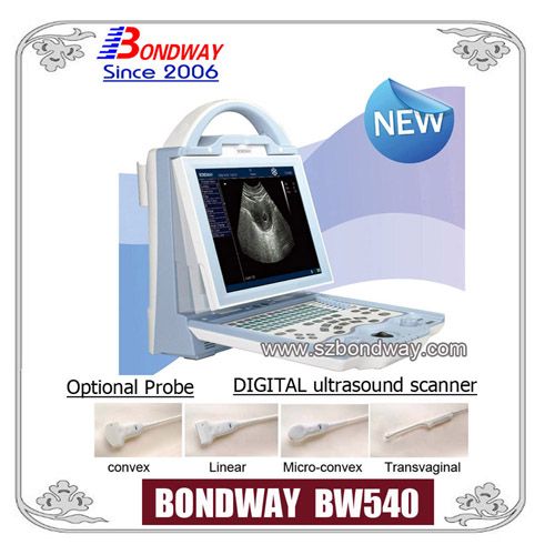 Benefits 1) Smaller-sized and very light for easy carry-on. 2) Rechargeable battery operated and AC power supply. 3) Various types of Probes available for selection 4) Unbeatible Price. Practical software package for cutting down the cost of vet doctors. 5) Psuedo Color System Technical Specs: * 10.4' high resolution color LED backlight display, with high contrast and wide viewing angle; * Adopt ARM7 embedded control system +FPGA signal processing system + well selected ultrasound hardware system, all make the unit more stable. * Menu operation system, with different languages according to requirement including Spanish, English, French, Russian and Portuguese; *Two probe sockets, auto-identify different optional probe; * Body marks:total 64 kinds body marks indicating probe position; * Display mode:B,2B,4B ,B/M,M ; * Adjustable depth: 10 grades, max depth to 236mm; * Gain:0~127dB; * Contrast:27~90dB; * Gray scale:256; * 8 steps intelligent TGC; * Frame frequency: 30 frames /second * 8 kinds pseudo colors; * Image storage: 4G hard disk to permanently store about 5000 frames images;without loss when power off. * Cine loop:256 frames; * Puncture guide function with 2 correctable puncture guiding lines(adjustable angle & position)tion)tion); * the gravel software package with real-time position line measurement Various Measurements * Normal measurement: distance,perimeter, area, volume, angle, length and area stenosis ratio measurement. *Cardio measurement:Depth, slope, heart rate, cycle; * Gynecology measurement and analysis: gynecology general measurement and gynecology report. * OB measurement including: 15 kind of obstetric software, several GA measurement, amniotic fluid index ,fetal growth curve and OB report. * Urology measurement and analysis: residual urine volumem, prostate volume, and urology report One-Key Operation for easier operation * One-key store: concise and practical; * One-key review:fast, practical image review function; * One-key Print; * One-key Transfer the current frozen image to net workstation to complete its image text report and print directly; * Concise and practical, easy operation. The system includes network workstation to complete data & report management (You don't need to invest more to buy extra ultrasound working station)tion)tion); *Unique One-key-light keyboard function for black room use; * Display brightness adjustable; * Dual TV output: PAL/NTSC, can connect video printer when necessary; * Power supply:100-240V~ 1.2-0.6A frequency:50-60Hz; * Power supply adaptor output:DC12.8V 3.0A; * Main unit weight:4.5kg(without accessories); * Main unit dimension:256××times;×150××times;×326mm(L××times;×W××times;×H); Standard Package: * Main unit with 10-inch medical LED monitor 1pc; * 2.0/2.5/3.5/5.0MHz convex array probe 1pc; * Power supply adaptor 1pc; * Reticle 1pc; * probe sockets 2pcs * One-key-light keyboard 1pc * Prefessional Software packages: Gynecology, Obstetrics, Urology, Cardiology, small parts, etc 1 set * User's Manual (English) 1 pc Optional parts: * Optional probes 6.5MHz multi-frequency trans-vaginal probe(through vagina) 6.5MHz micro-convex probe for small animals 7.5MHz multi-frequency linear probe 7.5MHz multi-frequency cavity probe (through anus) * Battery charger * Li-battery: HYLB-1614 11.1V-4400mAh 48.84Wh * Mobile trolley (cart) * Video printer(UP-897MD) or Mitsubishi P93W-Z * Ethernet Switch