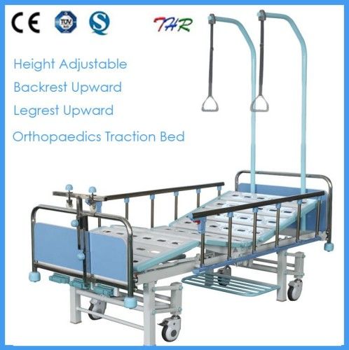 THR-TB004 3-crank Medical Orthopedic hospital bed 1) Dimension: L2020 x W900 x H500-750mm 2) bed base is made of cold-rolled steel plate and coated by electrostatic spray. 3) Aluminium alloy guard rails, retractable, easy operation. 4) Built-in cranks control back rest & leg rest upward and height function.tion.tion. 5) With protection rubber at the leg end. 6) with anti-bump cushion device on the bed corners for protection. 7) With oddment shelf under the bed. 8) With multi-function orthopedic traction frame, ensure traction treatment. 9) with special bed base structure: -When it is in lowest position, 4 steel tube of bed legs grounded to floor, preventing bed moving; -when it is in high position, 4PCS 125mm diameter castors let bed move easily.