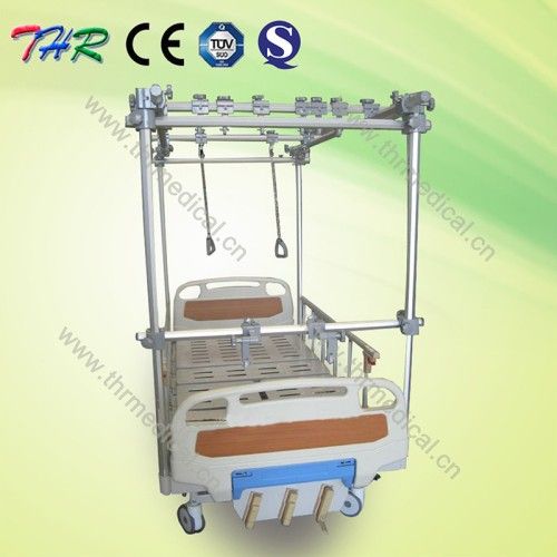THR-TB321 3-crank manual control type orthopaedics traction bed Description: -Dimension: 2120mm x 970mm x 485mm -The leg panel is separated into two parts which is more convennient for the Patient. -Bed board is made of cold-rolled steel by power coated. -ABS head and foot board easyload and unload, detachable. -four pieces 125mm diameter castor, with brake system; -Alumininum alloy guard rails with easy operation and complying with international stardand. -With high quality stainless steel orthopaedics traction frame, supplying convenience in operation.
