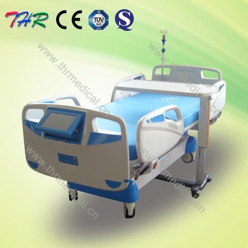 Luxurious ICU Hospital Bed(THR-IC-528B) Descriptions: N Specifications: Material: Steel framework, ABS&PP for plastic part part part Dimension: 2330mm(L)*1050mm(W)*530-710mm Bed board: 1955mm*900mm Net weight: 158 kg Loading capacity: 250 kg Castor: 150 mm swivel(central locking) N Features: 1. With easily operated touching switch, solve the problem of limited service life of mechanical keypad and keypad invalid due to constantly operating 2. Insert touching switch in the 2 pcs side rail at the head side, for patient adjust bed position easily. A 10.2' touching screen at the foot board, display all the bed position figures, with patient lock-out system, for nursing person's operationration 3. Back-rest(0-65 ° ), foot-rest(0-43 ° ), hi-low(710-530 mm), Trendelenburg(10 ° ) ℜv. Trendelenburg(10 ° ), all achieved by electrically controlled, with indicator light to show the work status.show the work status.show the work status. 4. Bed position data can be stored and callout 5. Function of weight scale, weight data can be stored and managed 6. Off-bed alarming 7. 'Reset' function(CPR function), bed can back to 'ZERO' position quicklyuot; position quickly 8. Backup battery, for emergency power failure 9. Detachable head&foot board in PP plastic, can be fixed when assembledmbledmbled 10.4 pcs foldable PP side rail, controlled by gas spring 11. Bed board with soft connection, make the bending of the bed board more smooth to let the patient feel more comfortable. 12. Central locking castors controlled by electric 13. IV pole mount backrest, at 4 corners of the bed frame. N Accessory: IV pole(Standard configuration) Over bed table(optional) Bed side cabinet(optional) 10 cm mattress(optional) N Packing: Wooden case 2080*1060*610 mm