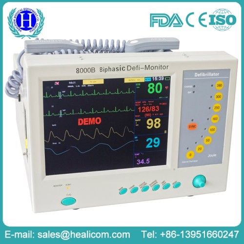 Physical characteristics: Main unit: Desktop Dimensions: L410xW360xH260 Weight: 12kg Technical specifications DEFIBRILLATOR. (1) Defibrillator type Manual, Synchronized, Asynchronized, (2) Energy accuracy +1% (3) Energy selection 0, 20, 50, 100, 160, 250, 300, 360 joules (nominal at a resistance of 50) (4) Charging time Maximum 10 seconds to 360 Joules (5) Standard Adult/Pediatric Paddles Reusable external adult paddles(pediatric paddles integrated) Power requirements (a) AC Power supply 100V~240V, 50Hz/60 Hz (b) Vehicle Voltage(Option) DC 12V Internal Battery Backup (1)Battery type Rechargeable lead-acid battery (12V 2.0Ah X2) (2) Charging time Time-Minimum of 4 hours for full charging (3) Battery charging During AC Power Supply operation of the device. (4) Charging /Low Battery Indication Red LED (5) Battery Capacity 100% of the battery will provide 120-min of monitoring; And 35 discharges at 360 joules. Display -LCD Dimensions 10.4 inch -Type High resolution true-color graphic LCD ECG ECG lead: I, II, III, AVR, AVL, AVF, V1~V6 S-T segment analysis: -2.0~2.0mv Arrhythmia analysis: Yes Protection: With stand 4000vAc/50Hz voltage in isolation and work against electrosurgical knife and defibrillation Respiration Measurement method: Thoracic impedance NIBP Working mode: Manual/Automatic/stat Method: Automatic oscillation Cuff type: Standard Adult; Optional Pediatric/Neonatal Temperature Measurement range 20~45° Ceg; Ceg; C Resolution 0.1° Ceg; Ceg; C Pulse Oximetry(spO2) Display: Spo2 value, pulse histogram, waveform, Pulse Range: 0~99%for adult, pediatric and neonatal patients Probe: Standard adult finger clip Optional pediatric Y-type clip and neonatal wrap Pulse range Pulse range: 0-255bpm Standard parameter & configurationrationation ECG/ RESP/SPO2/TEMP/PR/NIBP/DEFIBRILLATOR Optional parameter Recorder, Li-ion battery (11.1V 4Ah X2)