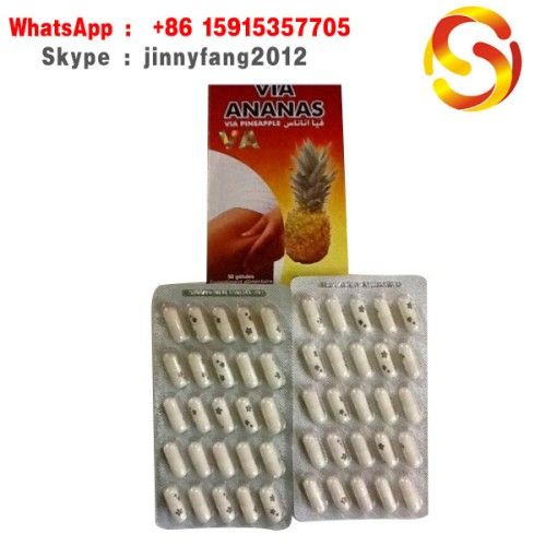 Product Description Via Ananas via apple is a product of diet pills, which are not considered as medicine but rather a food supplement made mostly from Pineapples. Via Ananas has become widely popular in the Middle East especially in Lebanon, Syria, Jordan. Via Ananas pills popularity came to being after its advertisements played repeatedly on Satellite TV channels such as Al Jaras Television, Masaya Television and others. It is one of the best-seller brand with high reputation from its consumers. Via Ananas pills functions: 1, Partial weight loss, mainly eliminate fat at the abdomen, buttocks and arms; 2, Solve the obesity problem completely, no rebounding; 3, Eliminate the harmful substances, beauty skin; 4, Take one capsule only a day. Directions for use: Take 2 capsules per day with water before the main meal. 2 capsules bring 400mg of Ananas. Precautions for use: Follow directions for use. Keep out of reach of young children. To be used in paralled with a well-balanced diet. Ingredients: - Pineapple (75.74%) - Stabilizing agent: Microcrystaline. - Cellulose; Anti Caking agents: Silica and Magnesium Stearate; Capsule (gelatine, colorant: Titanium dioxyde, water) Package: 50 capsules of 340mg Net weight: 17g Specification: 50 capsules/box Storage: Store in a cool and dry place Note: This product is not a medicine but a food supplement with plants.