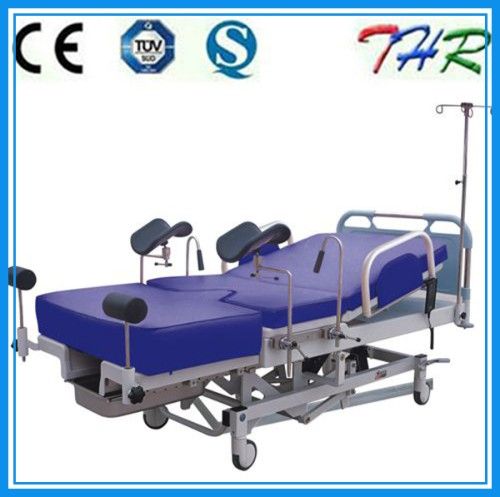 Gynecology Operation Table(THR-C101A02) ---THR-C101A02 Operating Table (comfortable) nursing the lying-in woman through all stages of parturition, including labor, delivery and recovery stage. ---It can be easily changed into chair position to protect lying-in women from transfer from one bed to another. ---Electric controlled height adjustment, tilt adjustment and back section adjustment greatly enhance the work efficiency of the nurses. Descriptions: A. Use imported European brand of motor and driven system. B. Centre brake and swivel system make the bed stable. C. Rotating side rails are easily operated. D. Minimum height enables patient get on the bed easily. E. Leg holder lockable, can turn forward & backward, left & right, height also adjustable.justable.justable. F. I. V. Stand, height adjustable. G. Head board, LED board moveable... H. Cushion for newborn baby used during parturition. J. Stainless steel basin and flume moveable for washing. K. Grab handle for lying-in woman to exert her strength. L. Cushion ventilating, water proof, soft and three different colors available, i. E. Rose, pink and blue. M. Foot switch and hand control optional. Technicial Parameter: 1. Bed dimension including bed end and bumper wheel: 2. Length2050mm, width 980mm 3. Bed dimension: Length 1815mm, width 880mm 4. Bed height: Lowest≤ 580mm, highest≥ 950mm (exclude the cushion)ushion)ushion) 5. Back section turning: ≥ 70° 70°deg; 70° 6. Trendelenburg and reverse trendelenburg: Reverse trend≥ 5° , trend≥ 12°end≥ 12°12°end≥ 12° 7. Leg section telescope: 550mm 8. Castor dia.: 125mm Standard accessories L Leg holder 1pair L Clamp 1 pair L Grab handle 1 pair L Foot rest 1 pair L Basin 1 PC L Water proof cushion 1 set L I. V. Stand 1 PC L Cushion for newborn baby 1 set L Cushion 1 set (includes back cushion, seat cushion and assist platform cushion) L Electric wire 1 PC L Foot switch (or hand control) 1 PC (optional)