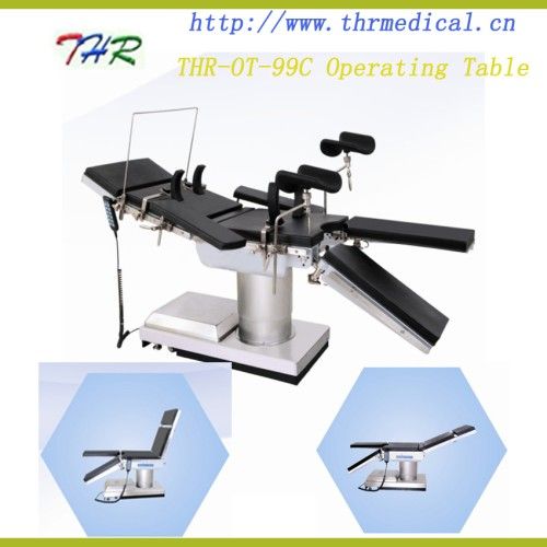 Electric Hydraulic Operating Table (THR-OT-99C) Specifications: 1. This Electric Operating Table 99C is developed independently by our company wity innovativ and advanced technologies. 2. The table is a compehesive one with high-quality and multi-purposes,which takes the leading position in the domestic market. 3. The table can be used in almost all kinds of operations by means of speical design. 4. The bedtop can be moved vertically and rotated horizontally. 5. The tableboard is made from high-intensity synthesis panel. 6. X-Ray transmissive, easy adjustment and easy use of C-arm make the table can be more capable for any operation. 7. The operating table is controlled by Control Circuit, which is easy operation, low noise,reliable performance. 8. 2000L operating table has almost the same functions with 99C, except that 2000L can't be moved in vertical direction. Technicial Parameters: ---Table dimension including the rails: Length 2040mm, width 500mm ---Table top dimension: Length 2000mm, width 500mm ---Table height: Lowest≤ 580mm, highest≥ 930mm; 930mm; 930mm ---Lateral tilt: Left≥ 15° Right≥ 15°ght≥ 15°15°ght≥ 15° ---Trendelenburg and reverse trendelenburg: Reverse trend≥ 20° Trend≥ 15°end≥ 15°15°end≥ 15° ---Head section turning: Up≥ 45° Down≥ 90°own≥ 90°90°own≥ 90° ---Back section turning: Up≥ 55° Down≥ 80°own≥ 80°80°own≥ 80° --- Leg section turning down: ≥ 90° 90°deg; 90° ---Leg section swing out: ≥ 90° 90°deg; 90° ---Backward and forward movement: 250mm ---Horizontal rotation of the tabletop: 180 °°deg;° ---Armrest swing out: ≥ 90° 90°deg; 90° Standard Accessories: A. Anaesthesia screen frame 1 set B. Body strap 1 piece C. Lateral support 1 pair D. Should holder 1 pair E. Leg holder 1 pair F. Clamp 1 set H. Arm rest 1 pair I. Hand control 1 piece
