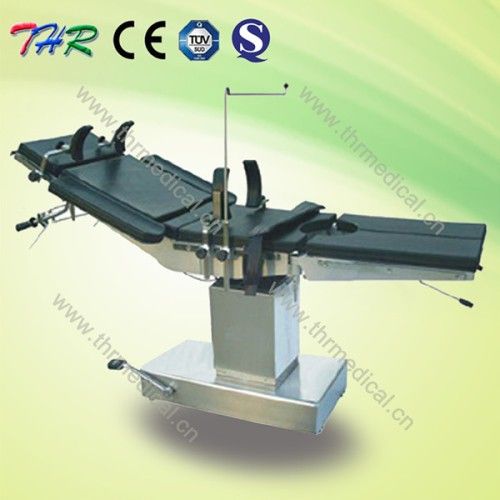Hydraulic Operating Table(THR-OT-S103C02) Descriptions: 1. THR-OT-S103C02 is a integrated manual operating table which is designed and manufactued to meet the consumers' needs and desires. 2. Superior stainless steel housing for the base set and support system of the table is one-time-formed. All mattresses are cast and made from polyurethane, easy to clean. 3. Moreover, the table can work without electric for its totally machinery structure. So it is safe and reliable for taking some ordinary operations, e. G., the operation on Chest belly surgery, ENT, gynecology and obstetric, urological, orthopedics. Technicial Parameters: ---Table dimension including the rails: Length2040mm, width 540mm ---Table top dimension: Length 2010mm, width 500mm ---Table height: Lowest≤ 830mm, highest≥ 1070mm 1070mm 1070mm ---Head section turning: Up≥ 28° Down≥ 45°own≥ 45°45°own≥ 45° ---Back section turning: Up≥ 70° Down≥ 15°own≥ 15°15°own≥ 15° ---Lateral tilt: Left ≥ 15° Right≥ 15°ght≥ 15°15°ght≥ 15° ---Trendelenburg and reverse trendelenburg: Reverse trend≥ 25° Trend≥ 15°end≥ 15°15°end≥ 15° ---Leg section turning down: ≥ 70° 70°deg; 70° ---Leg section swing out: ≥ 90° 90°deg; 90° ---Armrest swing out: ≥ 90° 90°deg; 90° ---Kidney bridge lifting distance: 150mm Stabdard Accessories A. Anaesthesia screen frame 1 set B. Body strap 1 piece C. Lateral support 1 pair D. Should holder 1 pair E. Leg holder 1 pair F. Clamp 1 set G. Arm rest 1 pair PS: We still provide surgical lamp and scrub sink for hospital operation room
