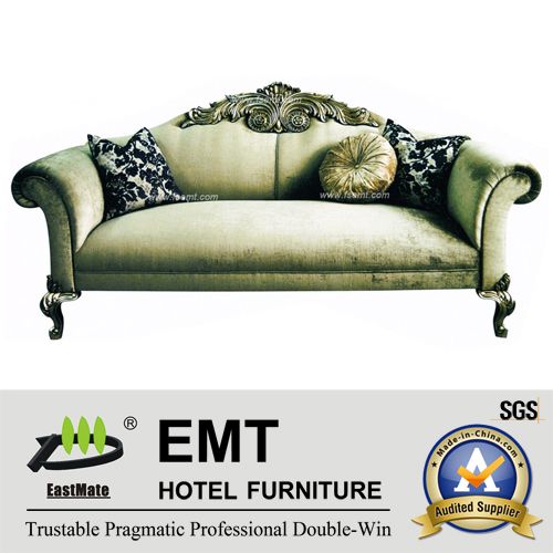 Deluxe Fabric Hotel Sofa (EMT-SF13): Luxurious hotel sofa set made by professional ISO9001: 2000 certified manufacturer with over 12 years of experience. Main Features of EMT sofa set: 1) Wood: Solid wood 2) Fabric: First-class fabric/top grain leather 3) High quality sponge filling 4) Kiln-dried hardwood frame 5) Double-dowelled joints with corner blocks glued and screwed 6) All exposed wood is consistent in color and quality 7) All joints ensured to be tight and uniform before shipment Language Option Packing method Four-layer packing: Plastic bag-polyethylene, high quality sack, or any packing Method as per customer's requests. Corner and key points protection in all Aspects. Material: Hand carving on solid kiln-dried rubber wood+Foam above 40 Degree+Highly durable sofa fabric. Silver leaf finish. COMPANY PROFILE: EASTMATE HOTEL FURNITURE CO., LTD (EMT HOTEL FURNITURE) is a professional hotel furniture supplier located in Foshan city of Guangdong province. We have a first-class ability in the design, production and marketing of hotel bedroom furniture and hotel public area furniture, which includes wooden furniture, wood doors, sofas, chairs, restaurant furniture, villa furniture, club furniture and mockup furniture etc. Moreover, we have a professional purchase team to work for customer to buy hotel supply and building materials including outdoor furniture, office furniture, hotel sanitary wares, hotel lights, hotel tiles, hotel beddings, hotel locks, hotel door hardware, safe, mini-bar and other hotel supply etc. With its powerful funds support, scientific management, advanced manufacturing facilities, talented designers and devoted workers, EASTMATE provided a reliable hotel supply solution for clients from domestic and overseas. Our factory covers an area of more than 218,000 SQM, and more than 280 professional staff works here. We have showroom more than 1000 SQM established for clients and designer to evaluate our ability and choose design elements. During our 8 years of development, we have successful cooperation with big hotel brands including HILTON, HOLIDAY INN, GRAND HYATT, RAMADA, CROWNE PLAZA and so on. From which, a strict working process has been developed and strictly followed from quotation, design concept communication, workshop drawing preparation, sampling and evaluation, sample improvement, mass production, production process control and pre-shipment control. In EASTMATE, always being 'Creditable, Professional, Pragmatic, Double-Win' is our key value like bloods flows in each member of our company. Teamwork and continuous improvement has been a part of our corporation culture.ion culture. Our mission is 'Making hotel supply sourcing a piece of cake' for our clients.our clients. EASTMATE staffs will continue its efforts to provide full satisfactory business solution for our clients with hotel furniture and hotel supply products more and more innovative, vogue, environment-friendly, decent and cost-effective. You are welcome to contact us with your requests and suggestions always! Export Dept. Hotline: +86-757-180 3878 3577