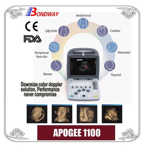 Apogee 1100 is our smart 4D Color Doppler ultrasound system with fashionable design (12' screen & 8kg weight) and cost-effective imaging performance. Not only its Multiple Imaging Technologies such as Spatial Compound Imaging, Speckle Reduction, Tissue Harmonic Imaging, Live Panoramic Imaging to assure clinical application, but also compatible with 4D probe & software (for fetus), Elastrography Technology (for breast cancer exam) and vaginal probe (for women urology exam) to facilitate women's exams. It is also integratable with smart trolley for mobile use.obile use.bile use.