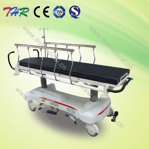 Luxurious Hydraulic Stretcher Cart(THR-111B) Size: 2120*800*610/930mm Material: 1)The bed is made of galvanized steel tube and surface coated by electrostatic spray. 2)The back board is made of American electrotyped board with X-ray cassette. 3)It is equipped with the imported double hydraulic rise-and-fall system. Introduction: The international advanced centrally controlled brake system is applied to the cart and 200 dustproof castors make the cart move steadily, reliably and lightly. The bed can be raised and lowered, tilted forward and backward which is controlled by the treadle lying on two sides of the bed. The bottom cover is made of PP material and shaped by once injection that can be easily cleaned. The cart surface is of separate structure and the upper part is supported by the imported large hydraulic pole to make the bed never sway. It is completed with infusion stand, drainage hook and collapsible aluminum alloy side rails. It is the best choice for emergency room, ICU, ICU bed and emergency bed for transferring patient.