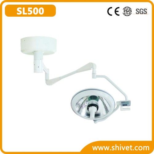 Veterinary Shadowless Operation Lamp(SL500) Model: SL500 Detailed information 1. SL500 Operating shadowless lamp can widely be used in diversified operation occasion to meet the demand of the illumination, and it is the ideal illumination instrument of the modern operating theater. 2. The Whole reflection optical system is made by CAD/CAM technology, its illumine depth is up to 700mm; By using color temperature compensation technology, the color reversion is uprised, and it is more suitable for the illumination of the complex surgery such as encephalon surgery and thorax surgery. 3. Micro computer digital control, with 8 shifts luminance for selection and it offers illuminance memory funcition and wide voltage working speciality, cam work stably under AC 150V~250V, with strong anti-jamming capacity. 4. Full close streamline lamp body design completely meets the demand of the sterilization and high standard of laminar flow purification in the operation room. 5. Water ripple panel is made of German PC (anti-bullet plastic) by injection moulding, makes the light softer and more reliable. 6. Focusing system has a delicate structure, and easy to change bulb and the ceramic seat; Detachable handle cover can take high temperature (≤ 134oC) sterilization treatment.ent.ent. 7. With back up bulb automatic switch function, when the main bulb was burnt, auxiliary lamp will be lighted in? Second. There's failure indication in the handle control panel, to recommend the bulb to be changed after operation. 8. Offering soft start up unit, extending the serve life of the bulb effectively. Adopting the imported long life halide-tungsten bulb, the bulb life can be up to 1000 hours. 9. All the key parts use the world famous products, ensure stable and reliable operation; Flame retardant level material can endure high temperature and safe, meets IEC norm. 10. Llluminance: 60000~120000Lux, 11. Color temperature: 4000± 500Kmn; 500Kmn; 500K 12. Illuminance depth (mm): ≥ 700 700 700 13. Operator head temperature rise(oC): ≤ 2e; 2e; 2 14. Temperature rise ((oC)(working area): ≤ 12; 12; 12 15. Brightness adjustment: 8-stage contimuous light adustment. 16. Shift of major and stand by lamps: Automatic. 17. Power supply voltage: ~220V/60Hz / 110V/60Hz 18. Input power (w): 200 19.24V bulb power(w)24v: 150w 20. Lowest height of installation: 2900mm Disposition detailed list 1 Rotator 1 500 lamp head 1 Spring Arm. 1 Plastic(PE) covers 2 Spare Halogen bulbs(OSRAM HLX64640 24V 150W) 4 Fuse ( RT1-32 2A RT1-32 8A ) 4 Installation bolts(M12*50) 1 Spare handles( autoclavebale) 1 Use Manual