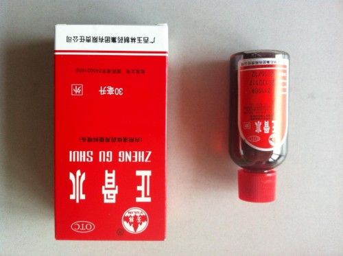 Zheng Gu Shui 30 ml Liquid herbal extract liniments, 30ml/bottle. Ingredients: Knotweed (Polygonum cuspidatum) rhizome (hu zhang), Guangxi Zedoaria rhizome, Croton root, Angelica root, Moghania root, Inula cappa root, Tien-chi ginseng root, Cinnamon bark, Menthol, Camphor. Administration: Rub liberally and firmly into the affected area as often as practical, or apply on cotton wool and bandage for up to 2 hours at a time. External use only. Cautions: Contraindicated during pregnancy, on children under the age of 5, in skin diseases such as eczema. Do not apply to broken skin. Avoid contact with mucous membranes, eyes and mouth. Flammable - Keep away from naked flames.