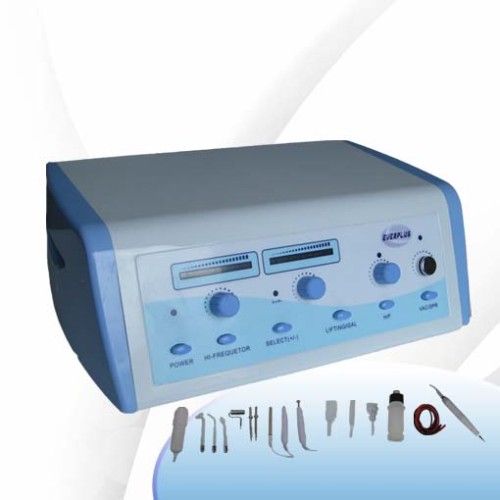 5 in 1 Multifunction facial beauty machine! ! ! Technical Standard: Brand: Beautyplus+, Everplus Voltage: AC200-240V/50Hz AC100-120V/60Hz Watt: 100W Wire Length: 1.8m Plug Standard: Chinese Standard (Can be changed to customer's requirement) Certification: CE Certificated Function: High frequency: 1. Helps to calm the nerve and analgesia function. 2. Produce the ozone for sterilization, help wound to heal and restrain pores. 3. Improve secretion, the PH value, causes the skin lean to neutrality. 4. Accelerate blood circulation and improve metabolism. 5. Anti-aging, anti-wrinkle, tighten skin. Galvanic & skin lifting:fting:ting: It is effective for revitalization for the skin, as it helps the active ingredients to penetrate deep into the skin. The penetration is much deeper than by manual applications. It is also to clear skin congestion and reduce surface oiliness, improve blood circulation and the normal functions of the skin. There is direct absorption of the products. It increases the efficiency of the treatment. First the skin prepared, according to skin type or individual problem, with cleansing and ozone. The specialized formulation is then applied, for the galvanic treatment. Since it clears congestion, It can benefit oily skin by removing sebaceous blockages. For dry skin and normal skins, hydrating and nourishing substances are applied. Skin lifting Vacuum: The suction is helpful in cleansing of the skin. It acts much like a miniature cleaner to suction cut the deeply embedded dirt, grease and other impurities. The suction also gives a deep penetrating massage and draws blood to the surface of the skin. Refine the striper pore, acne, pustule, clean the dirt and lipids inside the pore. Spray: The spray has many features when used in facial treatment. It helps achieve thorough cleansing of the skins surface. Also cool soothing and has a pleasant fragrance. The bombardment of spray is used to flush out the pores, especially after suction and squeezing of blackheads and pimples. Speckle remover: 1. Soften thrombus, remove erythema 2. Remove the scars after the acne is treated 3. Remove the abnormal skin color 4. Decompose abnormal pigment and remove flecks under skin 5. Prevent, remove facial wrinkles and extravasated blood 6. Remove eye-sack and black eye-rim 7. Soften nodule and cure acne 8. Cure the sclerosis and the parchment 9. Regularly massage the facial skin and improve its quality Accessories: HF: H/F Electrode Handle: 1 piece, H/F Glass Electrodes: 3 pieces. Galvanic & Skin lifting:fting:ting: Neg. Electrode Cable: 1 piece, Neg. Electrode: 1 piece, Pos. Electrode Cables: 2 pieces, Lifting Electrodes: 2 pieces, Half-Sphere Electrode: 1 piece, Bead Electrodes: 2 pieces, Cylinder Electrode: 1 piece. Vacuum & Spray:Spray:pray: Single Pipe 2 piece, Round Glass Tube 1 piece, Flat Glass Tube: 1 piece, Gourd shape Tube: 1piece, Spray Bottles: 2 pieces. Remove acne and pimple: Freckle pen: 1pieses Whitening needle: Large 1pieces, small: 3 pieces Packaging Standard: External Packing Size/set: 46x 36 x 23cm Net Weight: 4.5kg/ set Gross Weight: 5.5kg/ set