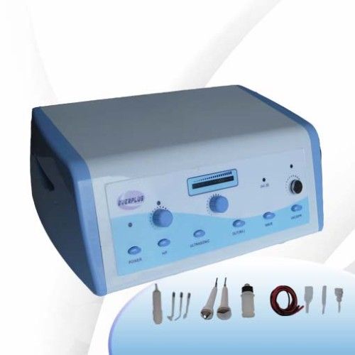 4 in 1 Beauty instrument electric clean & beauty set !!!et !!!t !!! High frequency & Ultrasonic &Vacuum Spraycuum Sprayuum Spray Technical Standard: Brand: Beautyplus+ , Everplus Voltage: AC200-240V/50Hz AC100-120V/60Hz Watt: 80W Wire Length: 1.8m Plug Standard: Chinese Standard (Can be changed to customer's requirement) Certification: CE Certificated Function: High frequency: 1. Helps to calm the nerve and analgesia function. 2. Produce the ozone for sterilization, help wound to heal and restrain pores. 3. Improve secretion, the PH value, causes the skin lean to neutrality. 4. Accelerate blood circulation and improve metabolism. 5. Anti-aging, anti-wrinkle, tighten skin. Ultrasonic: Helps deep penetrating Accelerates metabolism Stimulates blood & lymph circulationstionstions Eliminates blemishes & bagginessinessiness Reduces cellulites, fine line & wrinklesnklesnkles Relaxes tired muscles Vacuum: The suction is helpful in cleansing of the skin. It acts much like a miniature cleaner to suction cut the deeply embedded dirt, grease and other impurities. The suction also gives a deep penetrating massage and draws blood to the surface of the skin. Refine the striper pore, acne, pustule, clean the dirt and lipids inside the pore. Spray tonics: The spray has many features when used in facial treatment .It helps achieve thorough cleansing of the skins surface. Also cool soothing and has a pleasant fragrance. The bombardment of spray is used to flush out the pores, especially after suction and squeezing of blackheads and pimples. Accessories: HF: H/F Electrode Handle: 1 piece, H/F Glass Electrodes: 3 pieces. Ultrasonic: Ultrasonic probes 2 pieces: A. large flat (face and neck) B. small pointy (eye and nose) Vacuum & Spray:Spray:pray: Single Pipe 2 piece, Round Glass Tube 1 piece, Flat Glass Tube: 1 piece, Gourd shape Tube: 1piece, Spray Bottles: 2 pieces. Packaging Standard: External Packing Size/set: 46x 36 x 23cm