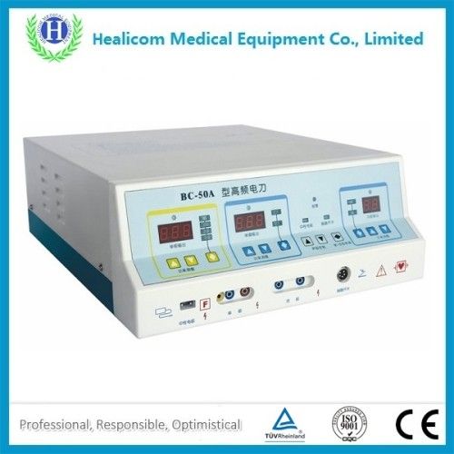 It's intelligent product. It has the features including: pure cutting, blend 1, blend 2, blend3, monopolar contact coagulation, monopolar standard coagulation, bipolar standard coagulation and so on. Monopolar electrode can be hand or foot-controlled, while bipolar electrode can be automatic and foot controlled. The system can automatic switch between monopolar and bipolar. The output power can be digital displayed. output sound level can be adjusted. The malfunction can be self-diagnosed by the system, and error code will be displayed, with visual and audio alarm. The system has NE CONTINUITY MONITOR, intended for connections, as well as Neutral electrode contact quality monitor (CQM),intended for connection to a MONITORING NE (split plates) providing an alarm in the event that NE contact with the PATIENT becomes insufficient. This system can be used together with the endoscope, to perform endoscopic surgery.