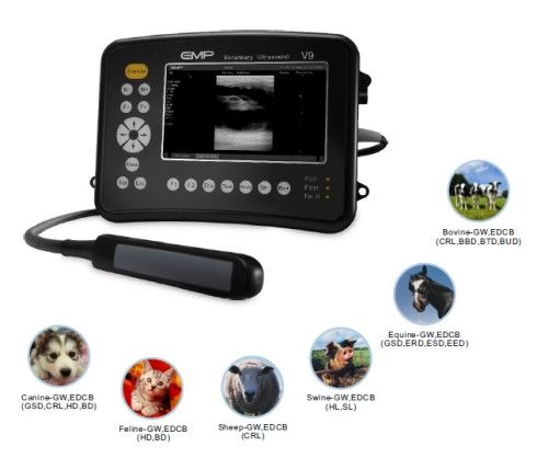 Delicate Hand-carried Veterinary Ultrasound System, Exquisite Image Quality. Comprehensive Applications and Superior Adaptability: By following the growing needs of different clinical applications, abundant professional software packages for veterinary used are installed into V9, providing you the superior adaptability during any diagnosis. Canine-GW, EDCB(GSD, CRL, HD, BD) Feline-GW, EDCB(HD, BD) Equine-GW, EDCB(GSD, ERD, ESD, EED) Swine-GW, EDCB(HL, SL) Bovine-GW, EDCB(CRL, BBD, BTD, BUD) Sheep-GW, EDCB(CRL) Standard Configuration: 7 inch LCD Monitor Pseudo Colors 9 Rechargeable Built-in Battery 365 Frames Bi-directional Cine-loop Dimensions(mm): 250(W) x 100(L) x 185(H) Abundant Software Packages
