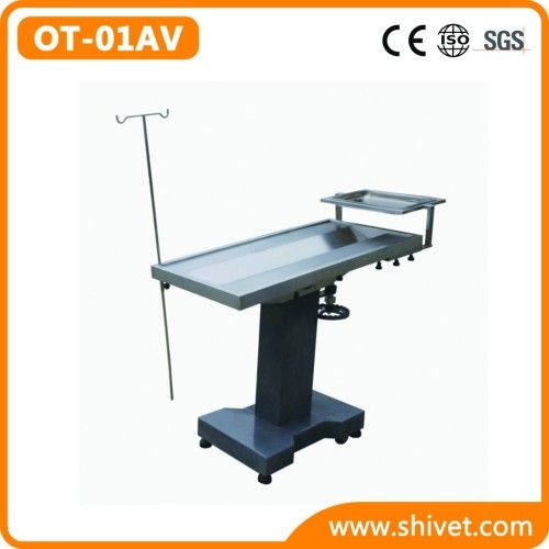 Veterinary Operating Table(OT-01AV(U)) Model: OT-01AV(U) Feature: 1. Noncorrosive table-board is made of stainless steel plate with high quality, which makes easy washing and disinfection. 2. Right-and-left gradient is 15° , regulated by the manual machinery system.stem.stem. 3. Fore-and-aft gradient is 45° , regulated manually.ally.ally. 4. Base plate is made of A3 armor plate with baking finish, and the casters add its mobility. 5. Matched with the operating bracket tray. 6. Table-board height is from 820mm to 830mm. 7. Table-board size is 1000mm*500mm. 8. Designed with reasonable machinery, credible performance and simple operation.