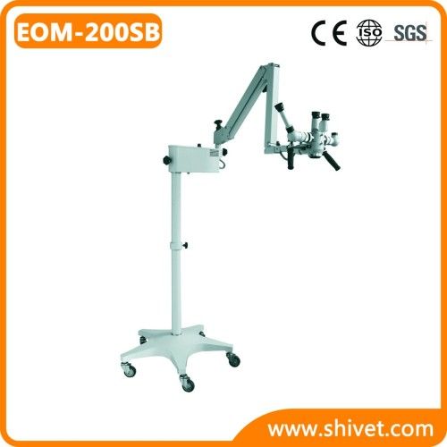 Veterinary Operation Microscope (EOM-200SB) Model: EOM-200SB Specification of Veterinary Operation Microscope: Observation angle: Straight Magnification of observation: 6X Focal length of objective: F=200mm, 250mm, 300mm, 400mm four objectives Magnification changer: 3-step: 0.6X, 1X, 1.6X Total Magnification: 2.4X-12X Fine focusing distance: 10mm Illumination: Coaxial illumination with cold light source fiber-optic cable, brightness adjustable Lamp: 21V150W halogen lamp Filter: Build-in green and yellow filter With beamsplitter, TV adapter. Demonstrator optional With 2-part arm, counterweight adjustable and can be locked With floor stand